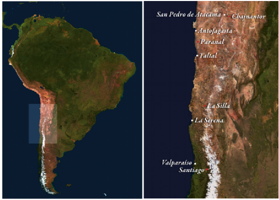 位于南美洲南北向最長的國家——智利。右側(cè)是左側(cè)白色陰影區(qū)域的放大圖,可以看到La Silla, Paranal,Chajnantor這三個臺站的位置。